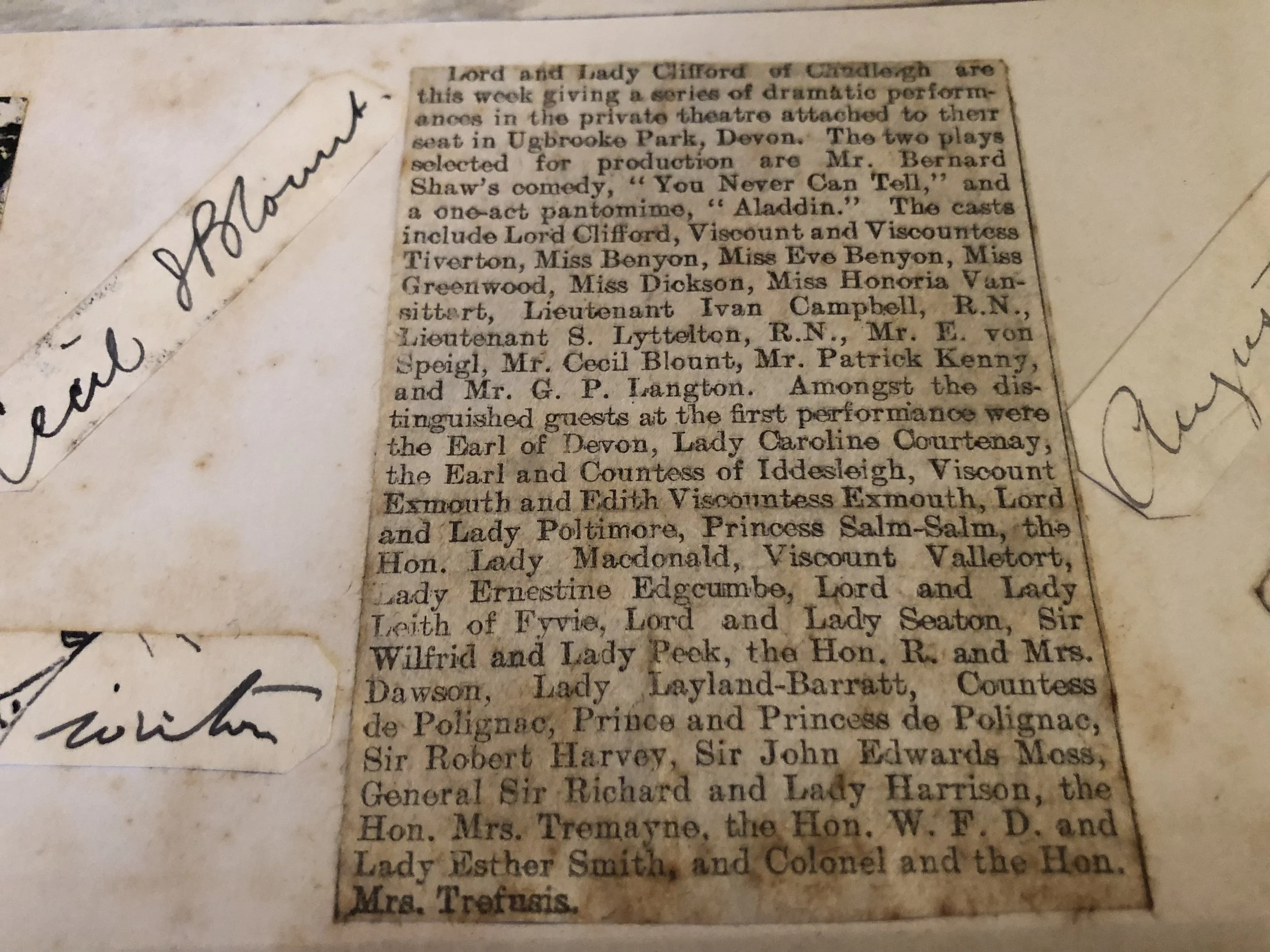 In January 1910, when she would have been just 17, she found herself at Ugbrooke Park in Chudleigh, Devon, performing a small part alongside her illustrious host Lord Clifford who seems to have taken enthusiastic part in the plays.